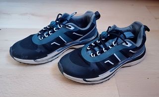 Zapatillas azul marino con rayas granate y gris Pespunte y cordón blanco. Muy cómodas y ponibles . N° 37