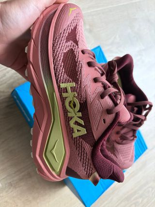 Zapatillas Hoka Challenger 8 para trail running. - Diseño en tonos rosa y verde. - Parte superior de malla transpirable. - Suela con buen agarre para terrenos irregulares.