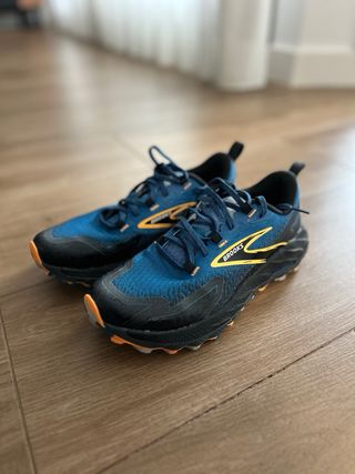 Zapatillas de trail running Brooks Cascadia en color azul, negro y naranja. Diseñadas para ofrecer comodidad y rendimiento en terrenos irregulares. - Parte superior de malla transpirable. - Suela con gran agarre para tracción. - Detalle de logo en el lateral. Zapatillas usadas solo para probarlas en un paseo con el perro. Están nuevas, se puede apreciar en las fotos. Con su caja original. Envío en el mismo día o al día síguiente