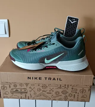 Zapatillas de trail running Nike, a estrenar. - Diseño en color verde azulado y detalles en naranja. - Suela blanca con detalles en naranja. - Cordones a juego con el diseño. - No tienen uso, están nuevas sin estrenar. La talla es pequeña para mi pareja, por eso las vendo.