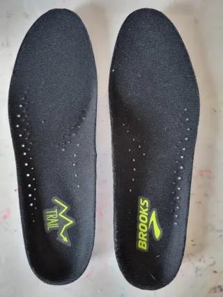 Plantillas Brooks para trail running. Diseñadas para ofrecer soporte y comodidad en terrenos irregulares. Son de zapatillas Cascadia 16. Talla 41. Sin usar por tener plantillas propias. - Logo TRAIL en verde. - Logo BROOKS en verde. - BioMoGo Sockliner