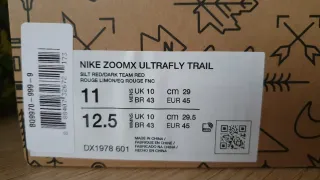 Zapatillas Nike ZoomX Ultrafly Trail en color Silt Red/Dark Team Red. - Talla UK 10 / EUR 45. - Modelo DX1978 601. - Fabricadas en China.
