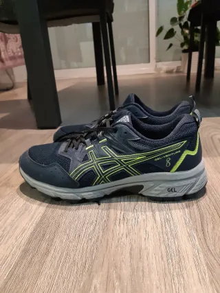Zapatillas de trail running Asics Gel-Venture 8, en excelente estado y casi sin usar. Perfectas para tus aventuras al aire libre. - Diseño en azul y verde vibrante. - Suela con tecnología GEL para mayor amortiguación. - Ideales para terrenos irregulares.