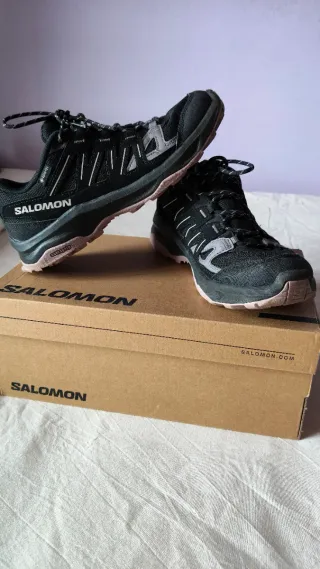 Zapatillas de senderismo, están nuevas apenas usadas. La vendo porque me quedan pequeñas. Compradas hace 3 meses, están nuevas Zapatillas de trail running Salomon Storen con tecnología Gore-Tex. - Diseño en color negro con detalles en rosa. - Cierre rápido con cordones. - Suela de goma para un buen agarre.