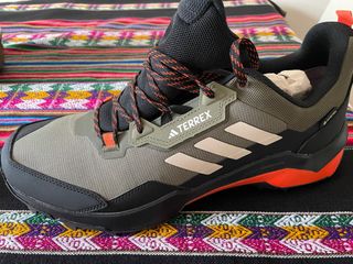 Zapatillas de trail running para hombre de la marca Adidas. - Diseño en color verde y naranja. - Detalle de las tres franjas icónicas de Adidas. - Logo de Terrex en el lateral. - Tecnología Gore-Tex para impermeabilidad.