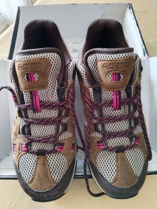 Zapatillas de montaña y trekking en talla 37. Diseñadas para ofrecer comodidad y protección en tus aventuras al aire libre. - Cierre con cordones y tanca. - Parte superior de malla transpirable. - Suela de goma adherente.
