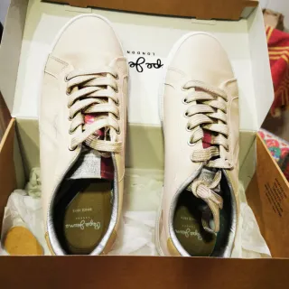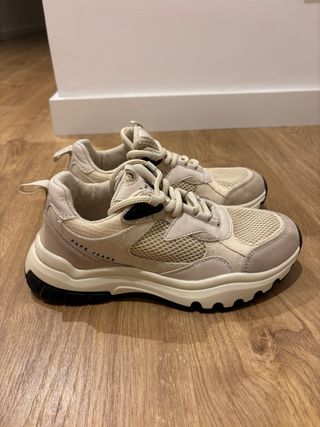 Zapatillas de la marca Pepe Jeans con un diseño moderno y elegante. - Combinación de colores beige y dorado. - Detalle de textura en el lateral. - Cordones a tono. Una puesta y en interiores,están como nuevas