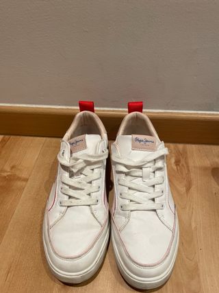 Zapatillas de la marca Pepe Jeans en color blanco con detalles. Talla 39 apenas un par de veces puestas, muy buen estado. - Cierre con cordones. - Detalle de tira roja en el talón. - Ribetes en color rosa y azul.