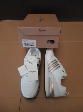 Zapatillas deportivas Pepe Jeans con un diseño moderno y elegante. - Combinación de blanco y detalles dorados. - Talla 40. SON MUY CÓMODAS NUEVAS CON SUS ETIQUETAS A estrenar Sin defectos