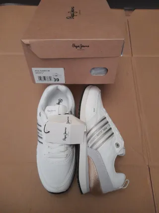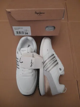 Zapatillas de la marca Pepe Jeans en color blanco con detalles dorados. NUEVAS CON SU ETIQUETA A ESTRENAR ESTAN EN SU CAJA ORIGINAL SIN DEFECTOS SON ORIGINALES - Diseño moderno y cómodas - Talla 39.