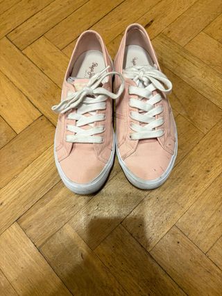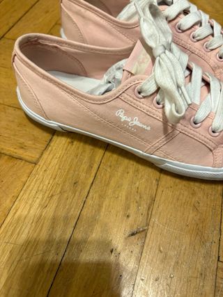 Zapatillas de mujer Pepe Jeans, talla 39 (EU) / 6 (UK) / 25 (MX). Color rosa pastel con el logo de la marca Pepe Jeans en el lateral. En buen estado, usadas con cuidado, sin defectos. Fabricadas con materiales de calidad y suela resistente, ideales para un look casual y cómodo.