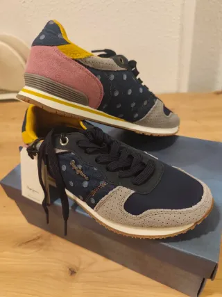 Zapatillas deportivas de la marca Pepe Jeans en talla 39. Combinan varios colores y texturas para un look moderno. - Diseño con detalles de lunares. - Paneles de ante y tela. - Suela de goma. Nuevas con etiqueta sin uso. Costaron 70€