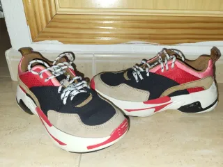 Zapatillas de la marca Pepe Jeans en talla 39. Combinan tonos marrones y rojos con detalles en beige y plateado. - Diseño deportivo y moderno. - Cierre con cordones. - Suela de plataforma.