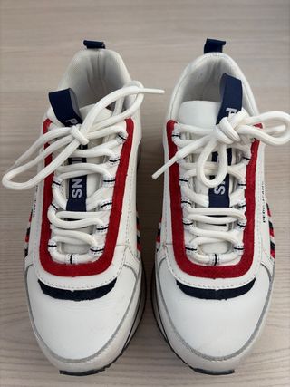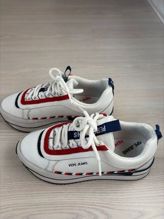 Zapatillas de la marca Pepe Jeans en perfecto estado, casi nuevas. Apenas 5-6 usos. - Diseño deportivo y moderno. - Combinación de colores azul y rojo. - Cierre con cordones.