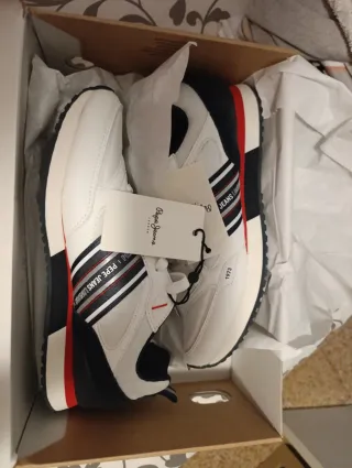 Zapatillas deportivas de la marca Pepe Jeans. - Diseño en blanco con detalles en azul y rojo. - Cierre con cordones. - Suela de goma. no hago envíos