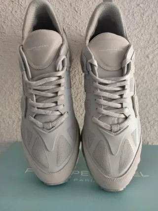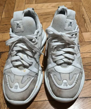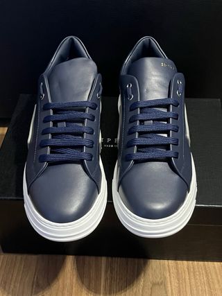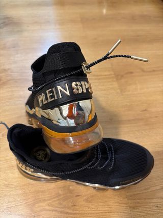 Zapatillas deportivas de la marca Philipp Plein. Sin originales, están usadas muy poco,se las puso 4 veces le hacían daño.. Están lavadas y guardadas en su caja - Diseño de punto. - Cierre de cordones. - Detalle de logo en la lengüeta y el lateral. En una de ellas , le falta un trozo a una N, ver en foto.. Hicieron cambio a la semana , pero se volvio a caer.