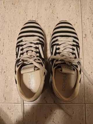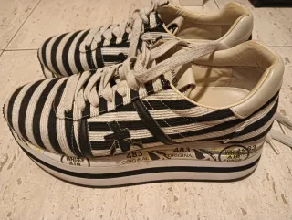 Zapatillas de la marca Premiata con un diseño de rayas en blanco y negro. Cuentan con una plataforma. - Diseño de rayas blancas y negras. - Plataforma. - Talla 37 (tallan grande)