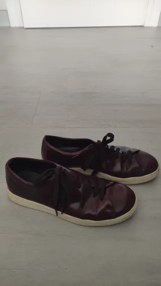 Zapatillas de la marca Prada en color granate. - Diseño de cordones. - Suela de goma.