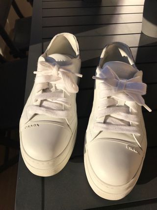 Zapatillas Prada originales. Son de piel blanca con logo metálico lateral y detalles grabados en suela y talón. Usadas solo en contadas ocasiones, se encuentran prácticamente nuevas (ver fotos). Perfectas para combinar con cualquier look. - Logo de Prada en la lengüeta. - Detalle metálico lateral. - Cordones blancos.