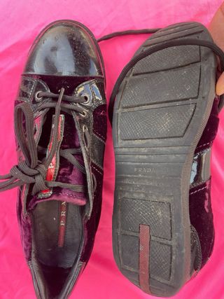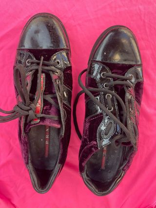 Preciosas zapatillas Prada de ante morado y charol negro. Ideales para darle un toque de estilo a cualquier look. - Son de cordones. - Están en buen estado. - Talla: (Añadir talla)