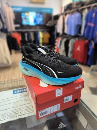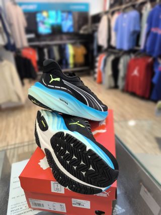 Zapatillas de running para hombre, modelo Puma Magnify Nitro 3. - Color principal negro con detalles en azul. - Talla 43.