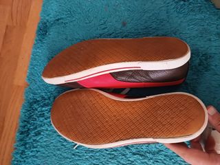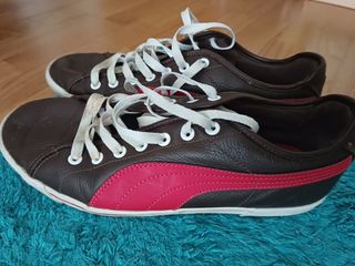 Zapatillas Puma de piel, en tonos marrones y rojos. Son usadas, pero están en buen estado. - Diseño clásico de Puma. - Suela de goma resistente. - Ideales para el uso diario.
