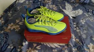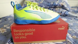 Zapatillas de fútbol sala para niño, con un diseño llamativo en verde y azul. Usadas solo en una única ocasión para un torneo de fútbol sala . - Marca Puma. - Cierre de cordones. - Suela de goma.