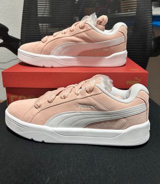 Zapatillas Puma de ante en color rosa con detalles blancos. - Diseño deportivo y casual. - Cierre con cordones. - Suela de goma blanca.