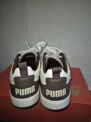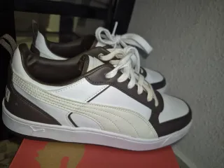 Zapatillas Puma con un diseño moderno y detalles en marrón. - Exterior de ante negro. - Detalle de ribete y lengüeta en color marrón. - Suela de goma blanca con detalles marrones. Solo entrega en mano. No hago envios envíos. Valencia