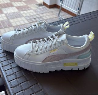 Zapatillas Puma Mayze con un diseño moderno y cómodo. - Exterior de cuero blanco. - Detalles en color rosa y verde menta. - Suela gruesa y plataforma. - Logo Puma en dorado.