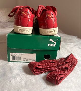 Zapatillas Puma Heart Basket en color rojo/granate. Un diseño llamativo con lazos. Cuenta con dos pares de cordones. Talla 38,5. Buen estado. Envío al día siguiente. - Acabado brillante. - Lazos de satén. - Suela de goma.