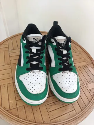Zapatillas deportivas Puma modelo Rebound. - Diseño moderno en verde y blanco. - Cierre con cordones negros. - Suela blanca. - Logo de Puma en el lateral y el talón.
