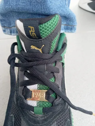 Zapatillas deportivas Puma con un diseño moderno y llamativo. - Combinación de colores negro y verde. - Detalles en blanco y dorado.