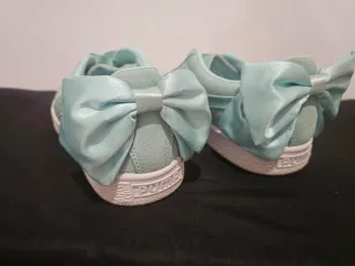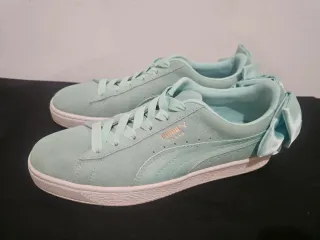 Zapatillas Puma Suede en color verde menta, talla 38. Un diseño clásico con un toque femenino. - Material exterior de ante. - Detalle de lazo de satén en el talón. - Suela de goma. - Cordones a juego.