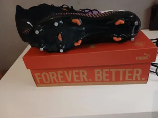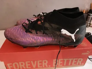 Botas de fútbol Puma con un diseño llamativo en negro y morado. Perfectas para destacar en el campo. - Parte superior con un patrón gráfico único. - Cierre con cordones negros. - Cuello elástico para un ajuste ceñido. - Logo de Puma en blanco en el lateral.