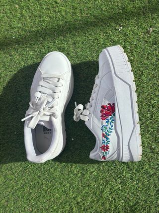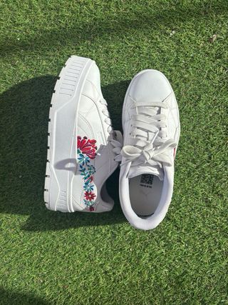 Zapatillas Puma blancas con un bonito bordado floral en el lateral. Un toque de color y estilo para tu día a día. - Diseño con bordado de flores rojas, azules y verdes. - Cierre con cordones blancos. - Suela de plataforma blanca. - Muy poco usadas, se venden por cambio de número.