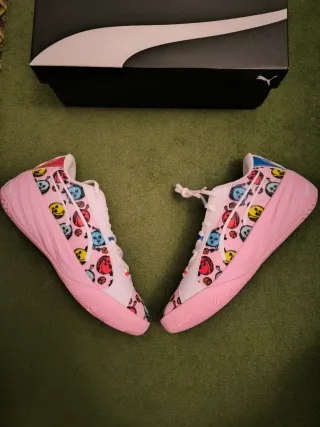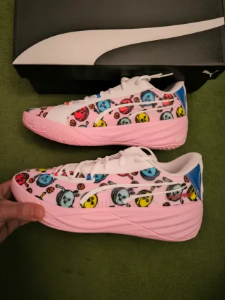 Zapatillas deportivas Puma con un diseño llamativo. - Estampado multicolor con caras sonrientes y balones de baloncesto. - Suela y detalles en color rosa. - Parte superior blanca.