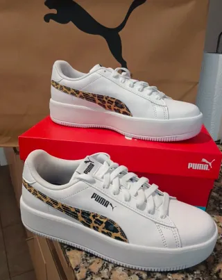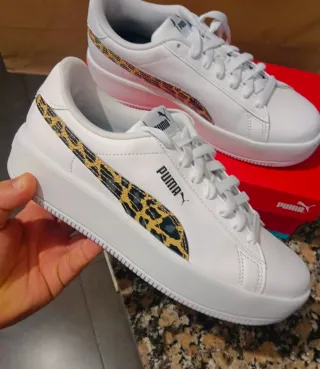 Zapatillas Puma con plataforma y un llamativo detalle de estampado animal. - Diseño moderno y cómodo. - Combinación de blanco y estampado. - Suela de plataforma gruesa.