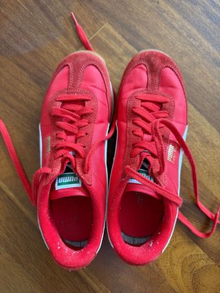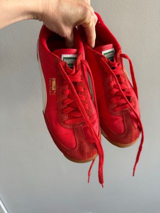 Zapatillas Puma modelo Basket en color rojo y suela blanca. - En muy buen estado, están un poco desgastadas en la parte interior del talón, pero no se ve al ponertelas. - Cierre con cordones. - Detalle de logo Puma en el lateral.