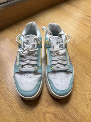 Zapatillas Puma de mujer en talla 38. Combinan blanco y azul con suela marrón. - Diseño deportivo y casual. - Detalles en gamuza.