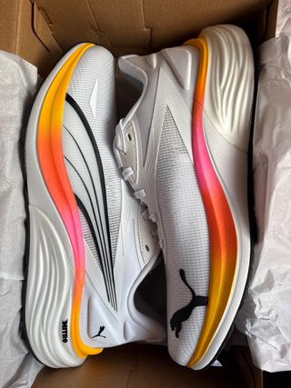 Zapatillas deportivas Puma Nitro 4 con un diseño moderno y vibrante. - Combinación de colores blanco, naranja, rosa y amarillo. - Detalle de franjas negras en el lateral. - Logo de Puma en negro.