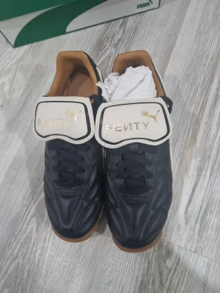 Zapatillas Puma Avanti VL Fenty, una colaboración entre la marca deportiva y Rihanna que fusiona el estilo retro del fútbol con moda urbana. Diseño: Inspirado en el modelo clásico Puma King, presenta una silueta delgada de cuero, suela de goma y una lengüeta doblada con la marca Fenty. Color: Negro con detalles en blanco. Características: Unisex, ligero y con materiales de cuero vacuno auténtico. - Diseño acolchado en la parte delantera. - Suela de goma. - Cierre de cordones. #vintage #riri #fenty #sneakers #aesthetic #retro #boho