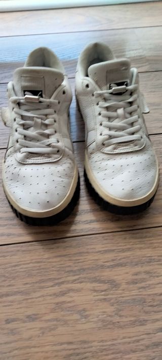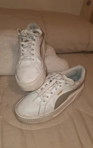 Vendo un par de zapatillas Puma blancas. Son de plataforma y tienen un diseño elegante y moderno. - Material: ante sintético. - Suela de goma resistente. - Perfecto estado.