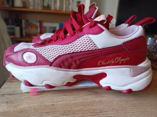 Zapatillas deportivas de la colaboración entre Puma y Charlotte Olympia en llamativo color granate. - Diseño con detalles en malla y cuero. - Logo de Charlotte Olympia en dorado. - Detalle de telaraña en el lateral. Vienen sin plantilla. La zapatilla derecha tiene un pequeño desperfecto en la suela lateral exterior, y la izquierda en la piel del lado interior, tal y como se ve en las fotos. Tienen muy poco uso.