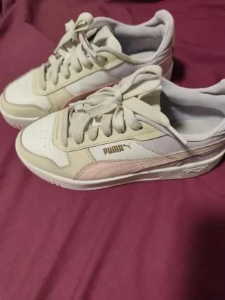 Vendo zapatillas Puma, prácticamente nuevas. Son de color beige y blanco, y lucen impecables. - Diseño moderno y elegante. - Ideales para el uso diario. - Cómodas y ligeras.