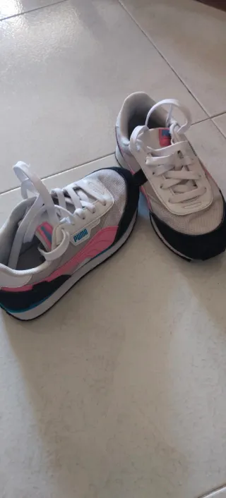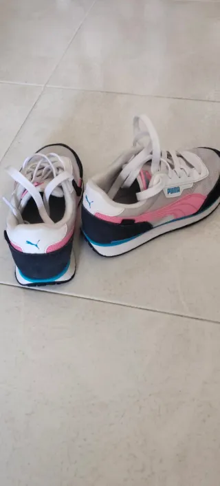 Zapatillas Puma en muy buen estado. - Diseño moderno con detalles en rosa y morado. - Suela gruesa y cómoda. - Materiales de calidad.