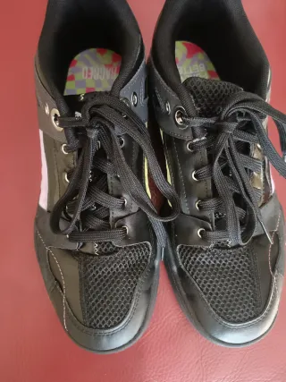 Zapatillas de serraje con un diseño moderno y cómodo. - Color burdeos. - Suela de goma en tono marrón. - Detalle de franja lateral en color crema. - Cierre con cordones. Se puede negociar el precio, pero a un precio asequible.