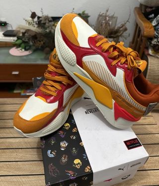 Zapatillas Puma RS-X edición especial Revelation de Netflix. Un diseño llamativo y único. - Combinación de colores: blanco, rojo, amarillo y naranja. - Detalles inspirados en la serie. - Cierre con cordones. - Sin uso - Perfecto Estado - Envío rápido