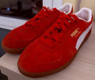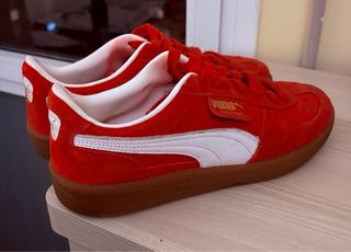 Zapatillas Puma Palermo de ante en color rojo. - Diseño clásico. - Suela de goma. - Detalle de franja blanca lateral. - Logo de Puma y Palermo en dorado. Usadas 3 veces.