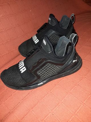Zapatillas deportivas Puma en color negro con detalles en azul. Solo usadas 1 vez Se vende por quedarme pequeñas - Diseño deportivo. - Cierre con cordones. - Logo de Puma visible.